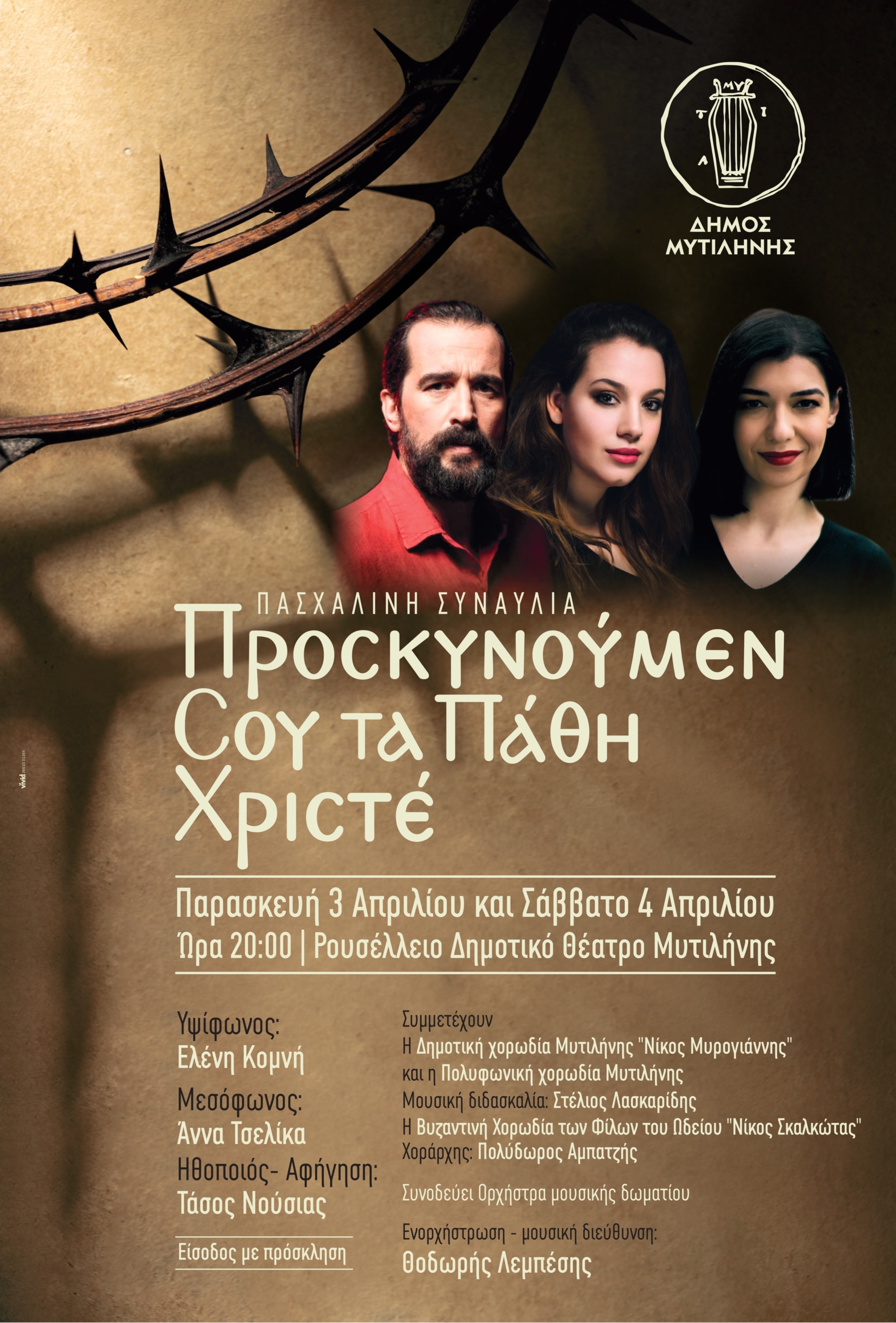 Ο Δήμος Μυτιλήνης διοργανώνει μια ιδιαίτερη Πασχαλινή συναυλία με τίτλο «Προσκυνούμεν Σου Τα Πάθη Χριστέ». Η εκδήλωση, που συνδυάζει αρμονικά μουσική και λόγο, είναι απόλυτα ευθυγραμμισμένη με το πνεύμα της Θρησκευτικής μουσικής της Μεγάλης Εβδομάδας. Θα πραγματοποιηθεί την Παρασκευή 3 και το Σάββατο 4 Απριλίου, στις 8:00 το βράδυ, στο Ρουσέλλειο Δημοτικό Θέατρο.
