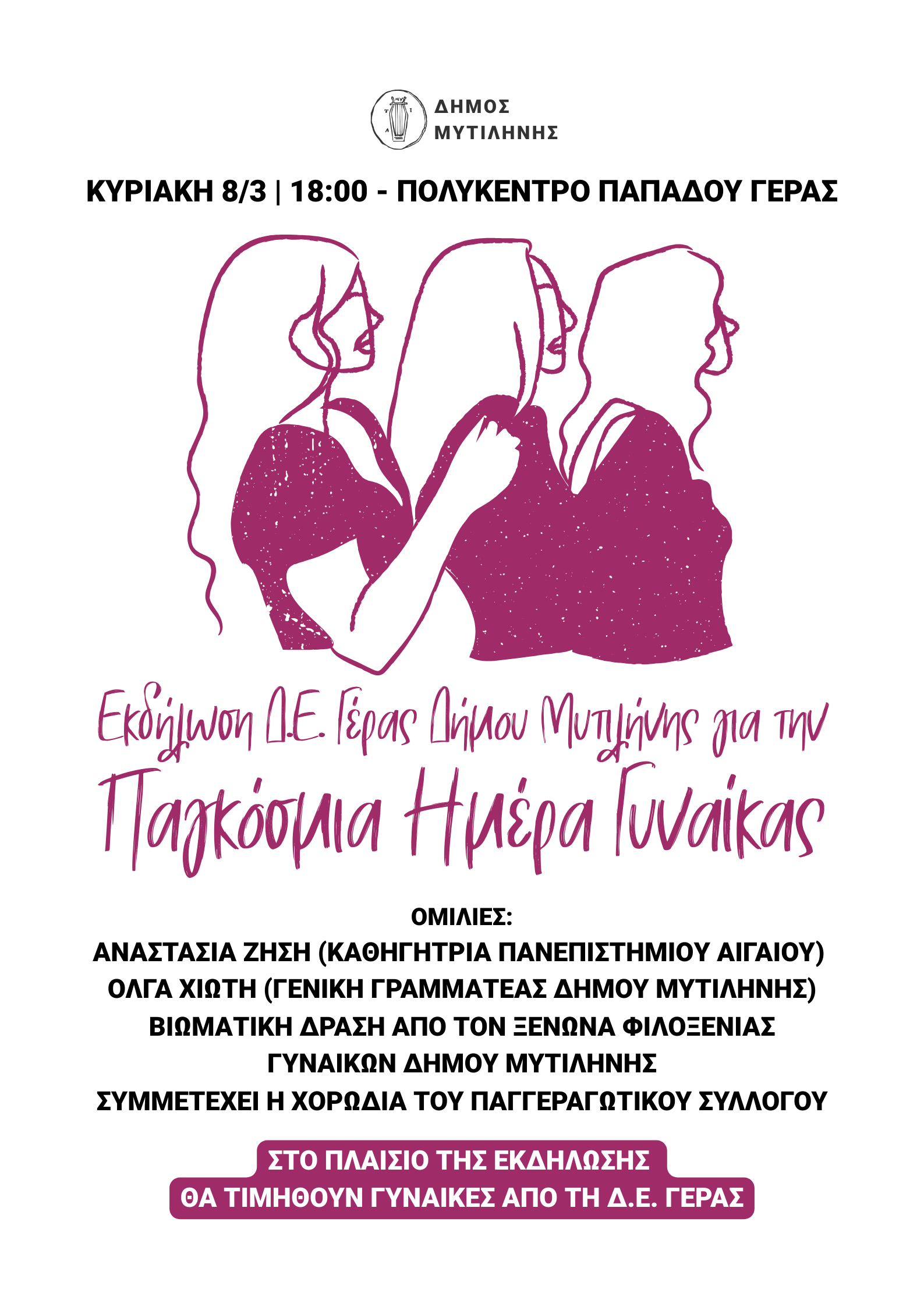 Η Δημοτική Ενότητα Γέρας και ο Δήμος Μυτιλήνης συνδιοργανώνουν εκδήλωση για τον εορτασμό της Παγκόσμιας Ημέρας της Γυναίκας. Η εκδήλωση θα πραγματοποιηθεί την Κυριακή 4 Φεβρουαρίου, στις 18:00, στο Πολύκεντρο του Παπάδου «Οδυσσέας Ελύτης».