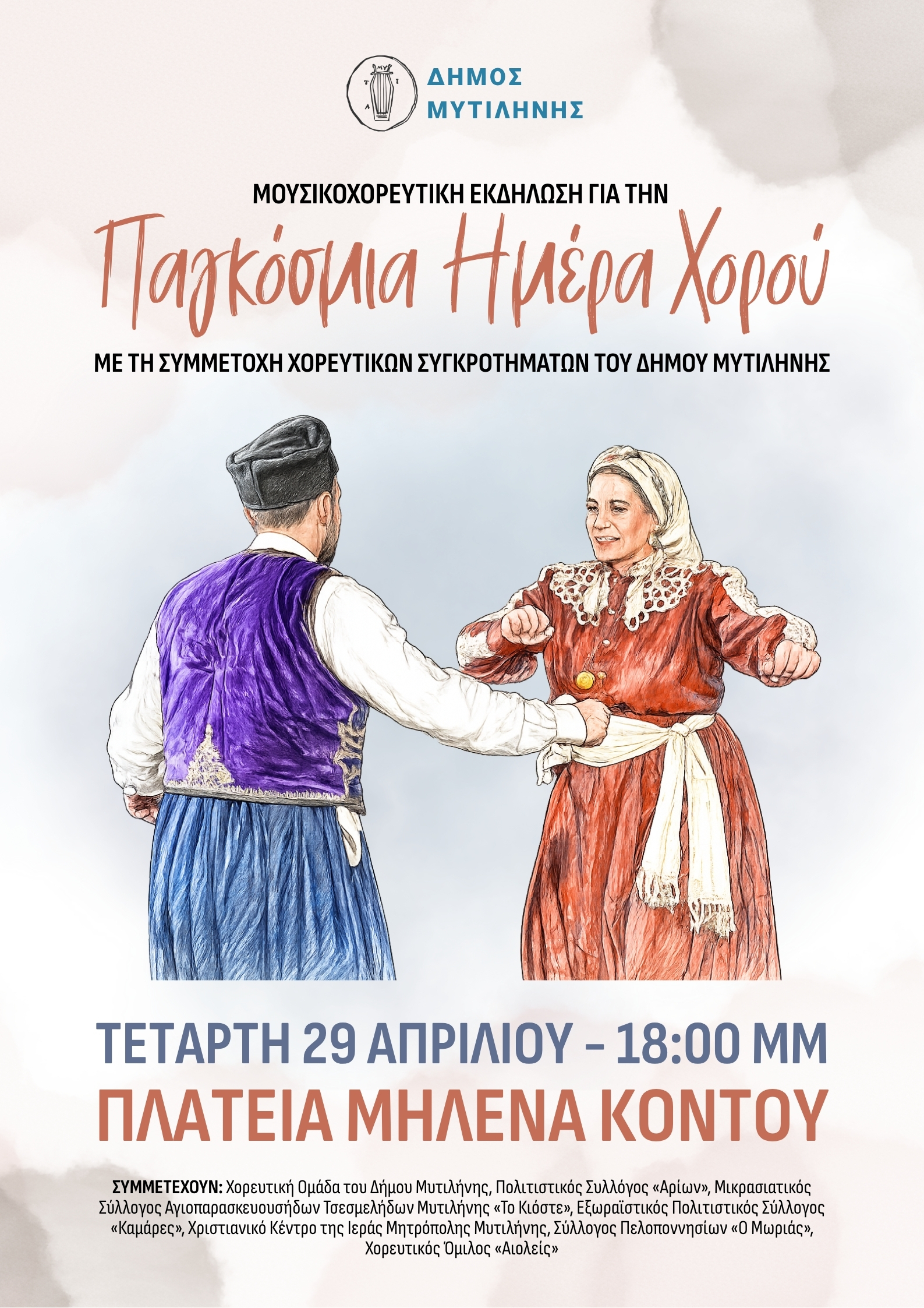 Εκδήλωση για την Παγκόσμια Ημέρα Χορού θα πραγματοποιηθεί την Τετάρτη, 29 Απριλίου, στις 18:00, στην Πλατεία «Μηλένα Κοντού» στο Μακρύ Γυαλό, με πρωτοβουλία του Δήμου Μυτιλήνης.
